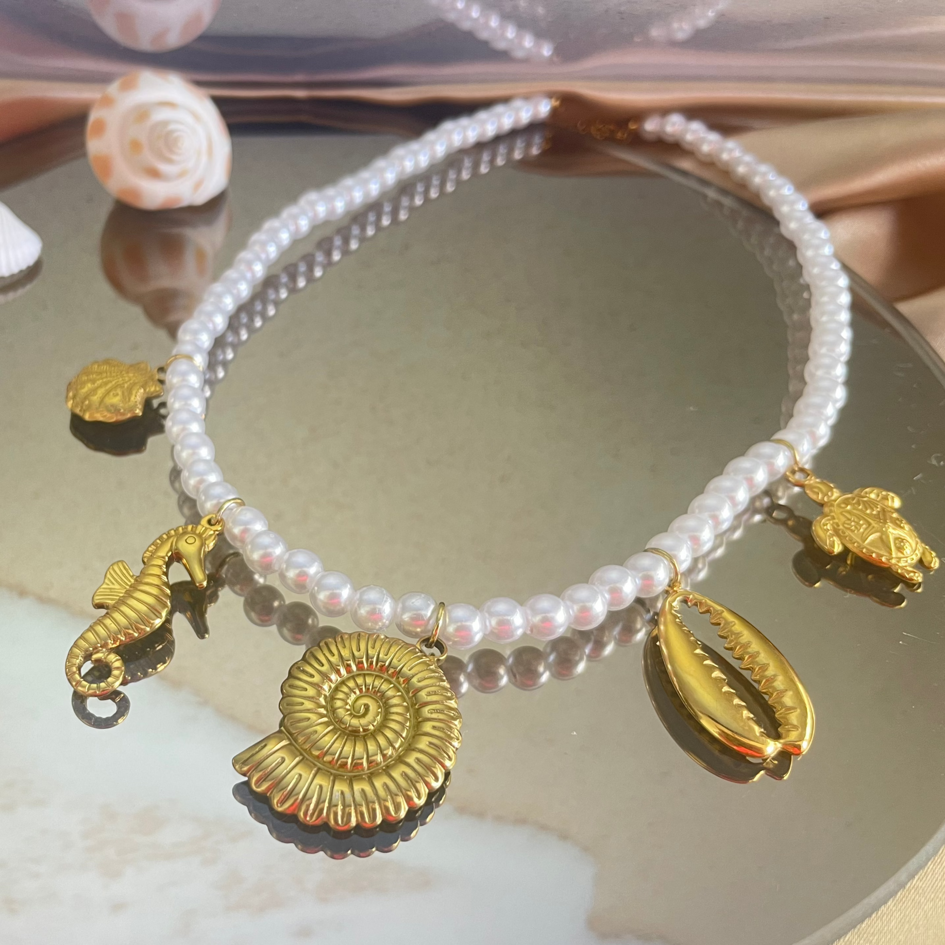 Ontdek onze handgemaakt ketting, geïnspireerd op het zeeleven met parels en zeedieren. De bedels zijn gemaakt uit edelstaal met een 18 karaat gouden laag.