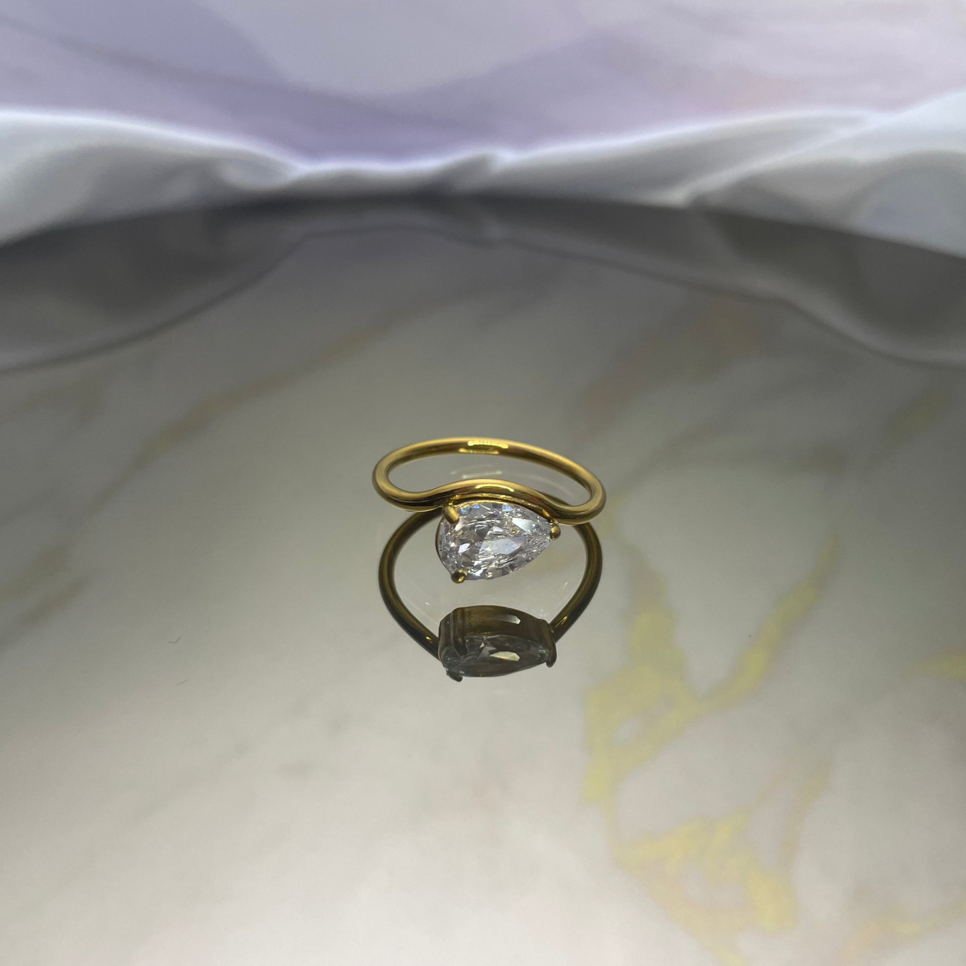 Prachtige ring uit edelstaal met een 18 karaat gouden laag en druppelvormige zirkoon.