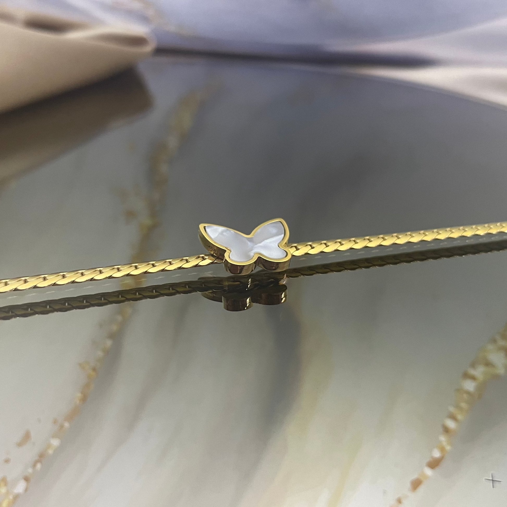 Prachtige platte schakelarmband uit edelstaal met een 14 karaat gouden laag en parelmoeren vlinder.